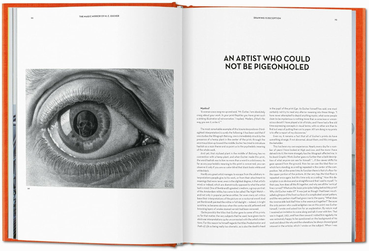 “A woman once rang me up and said, ‘Mr. Escher, I am absolutely crazy about your work. In your print Reptiles, you have given such a striking illustration of reincarnation.’ I replied, ‘Madame, if that’s the way you see it, so be it.’” A fittingly sly comment from renowned Dutch graphic artist Maurits Cornelis Escher (1898–1972), whose complex and ambiguous drawings continue to leave hasty interpretations far behind.